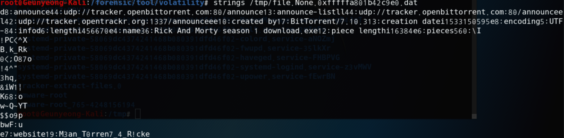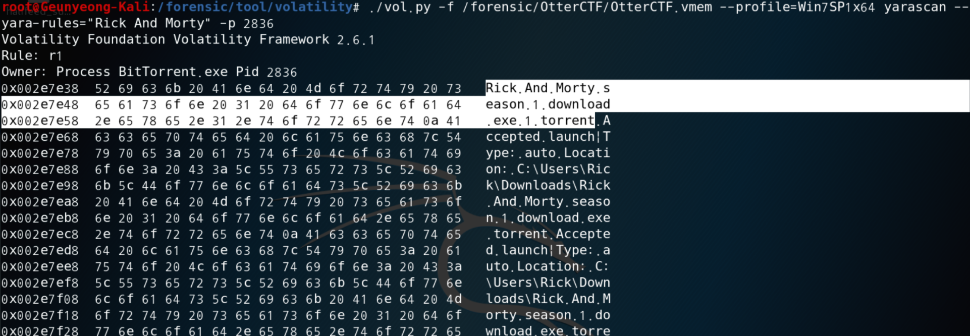 멀웨어인 vmware-tray.exe의 부모 프로세스였던 "Rick And Morty"를 키워드로 yarascan으로 BitTorrent.exe 메모리를 서치했다. 처음부터 exe 파일을 다운로드 하는 토렌트 파일이 보인다.