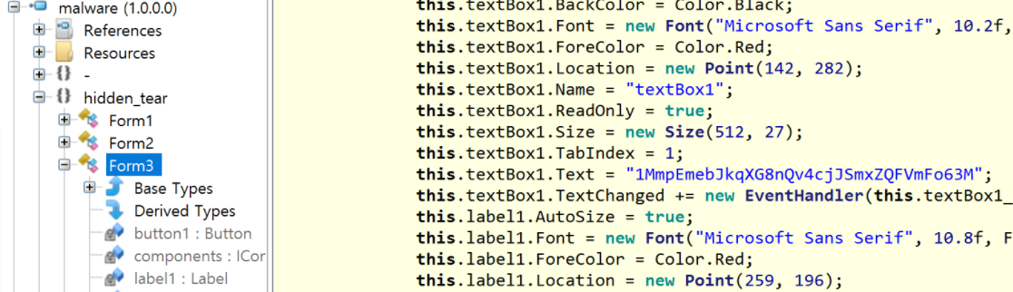ILSpy를 사용해 디컴파일 하면 Form1, Form2, Form3 총 3개의 클래스가 나온다. 그 중 Form3에서 정체불명의 문자열이 보였다.