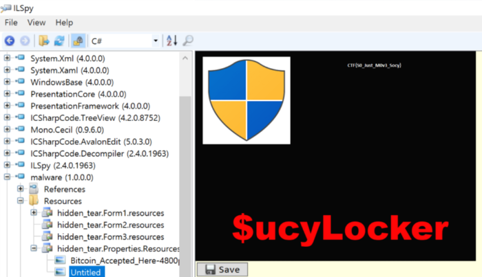ILSpy를 이용하면 C# 프로그램 내부에 들어있는 이미지 같은 resource도 볼 수 있다. 프로그램 내부에 포함된 이미지 파일을 살펴보던 중 플래그를 발견했다.