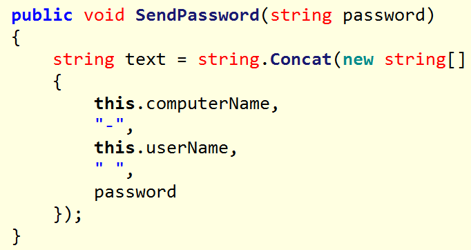 SendPassword는 컴퓨터 이름과 사용자 이름, 암호키를 하나로 합치기만 하고 아무 일도 안한다. (아마 실제 악성코드에서 서버로 키 정보를 전송하는 루틴을 삭제한 듯 하다.) 메모리 상에 3개 문자열(컴퓨터 및 사용자 이름, 암호키)을 연결한 문자열이 잔재해 있을 지도 모른다.