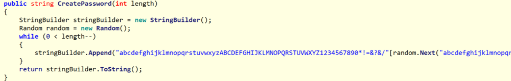 CreatePassword 메서드는 정의된 문자열 범위 내에서 랜덤하게 문자를 뽑아 새로운 문자열을 만들어 반환한다.