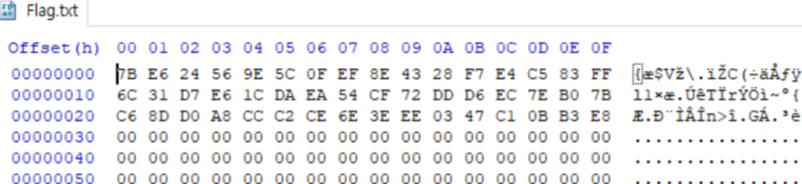HxD로 열어보니 임의 비트열 뿐이다. 암호화 된 듯 하다. 48바이트 이후론 모두 NULL 바이트여서 제거했다.