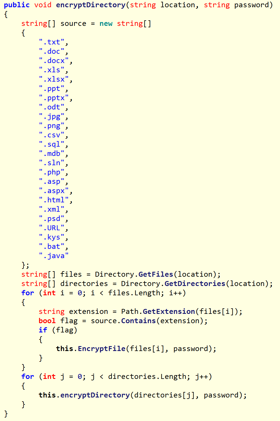 또한 encryptDirectory 메서드를 보면 암호화 할 파일들의 확장자 목록을 갖고 있다.