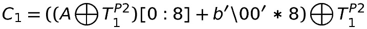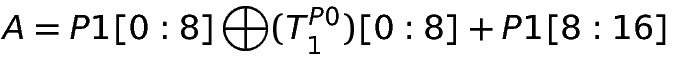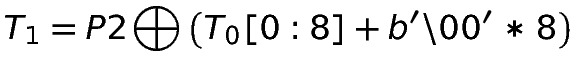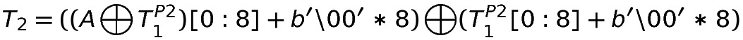 이제 임의의 P_{0}에 대한 T_{1}과 A를 xor 한 후, 임의의 P_{0}와 A^T_{1}을 이어 붙여 HalfFeed.encrypt하면 P0+P1에 대한 T를 알 수 있다. 단 이때 A^T_{1}의 앞 8바이트만 취하고, 뒤 8바이트는 모두 널 바이트를 넣는다.