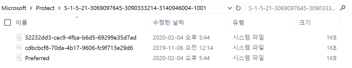 Preferred를 제외한 나머지 두 파일이 암호키를 만드는데 사용되는 MasterKey 파일이다. MSDN에 따르면 보안상 3개월 마다 마스터 키를 갱신한다고 한다. 실제로 위 그림 속 마스터 키 파일을 보면 3개월 차이로 만들어진 걸 볼 수 있다. 2019년 11월 6일에 만들어진 마스터 키는 만료되어 사용되지 않는다는 뜻이다.