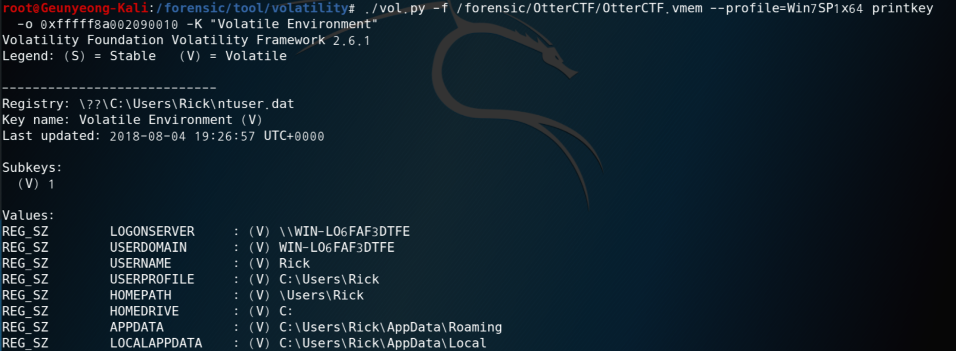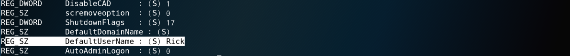위 SID 프로필 경로에 있는 ntuser.dat 하이브 파일의 Volatile Environment 키를 보니 USERNAME 데이터에 Rick이 들어있다. 위에서 구한 SID는 Rick의 SID로 보인다.