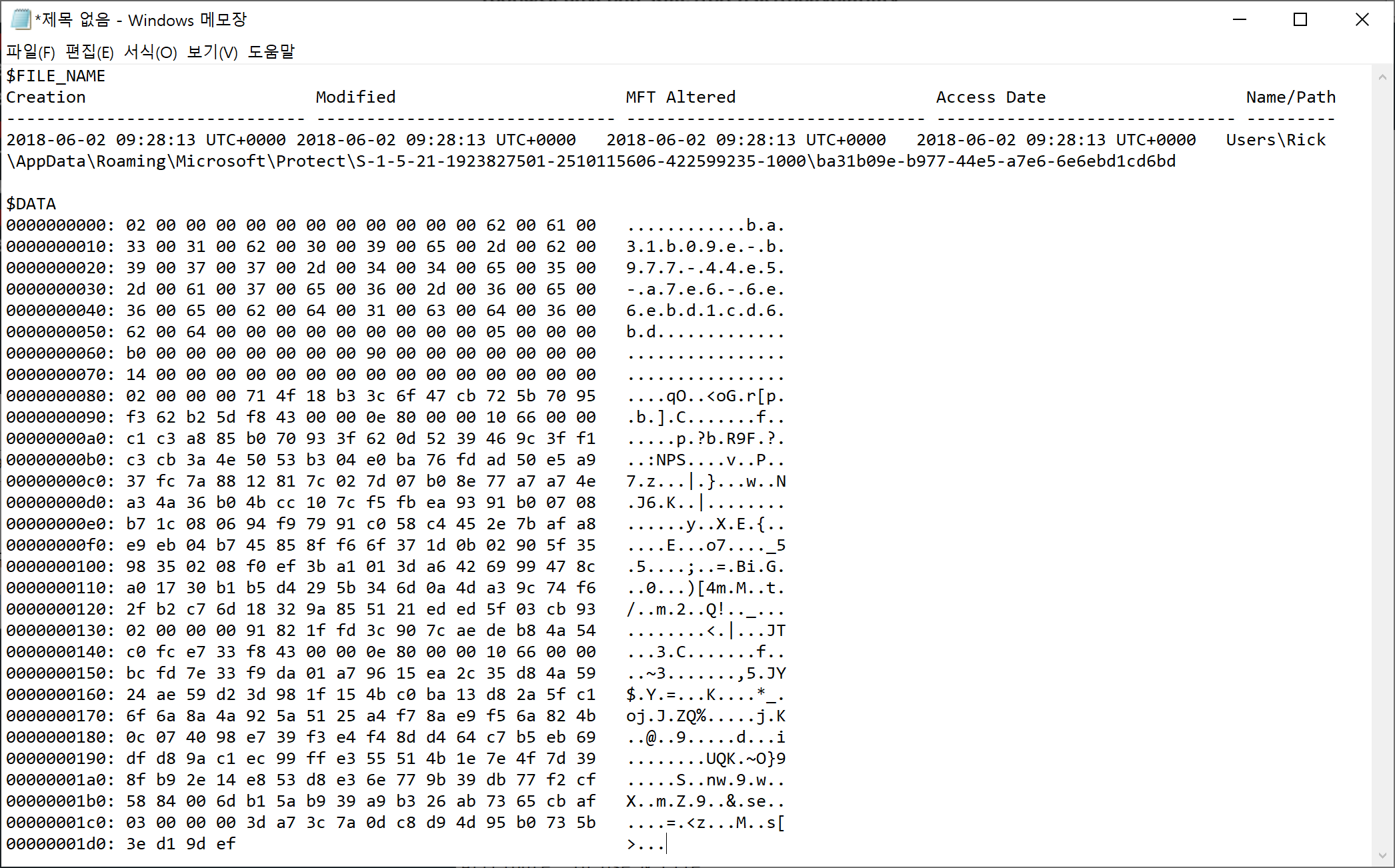 mftparser 플러그인을 사용하면 크기가 작은 일부 파일은 hexdump 형태로 보여준다. 이 파일이 chrome에서 사용하는 DPAPI 마스터 키인지 확신할 수는 없지만 한번 시도해보자.