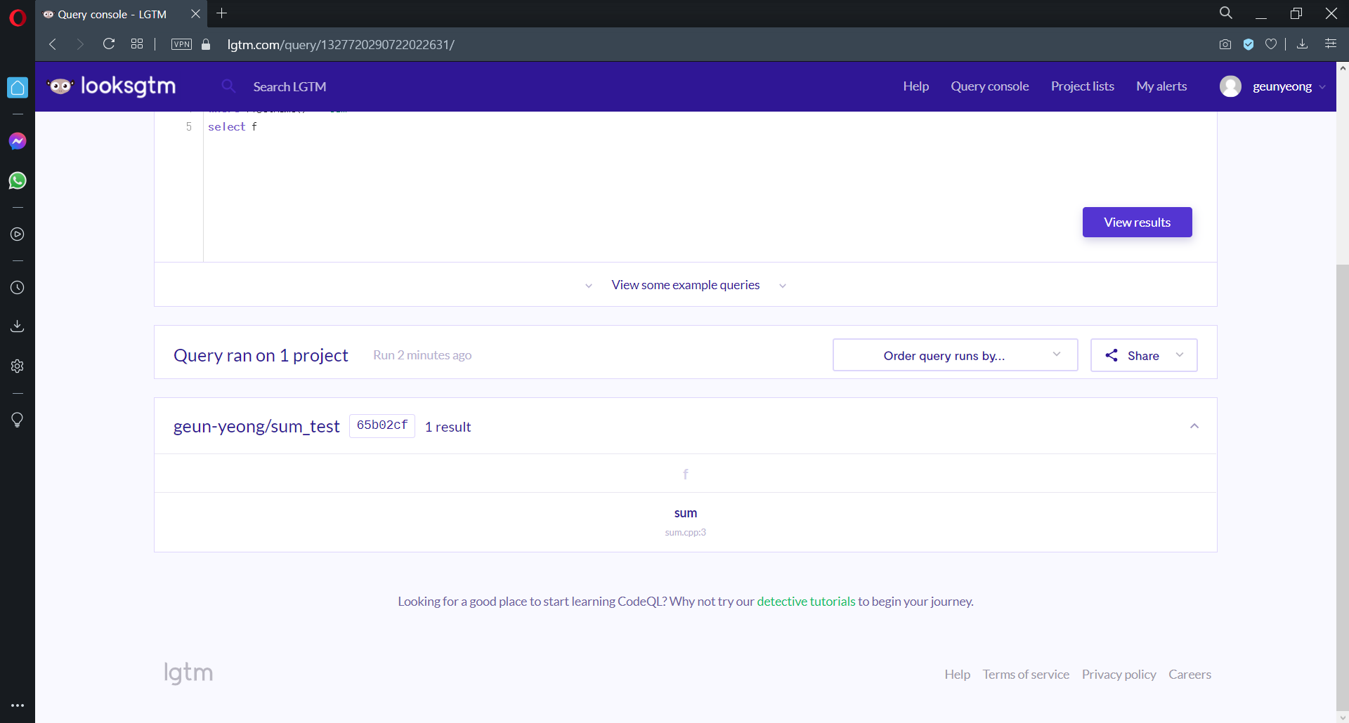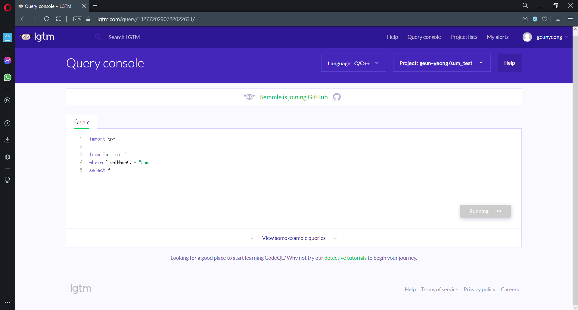 쿼리 수행 중에는 현재 코드를 스캔중인 프로젝트와 진행 상태를 보여준다. 쿼리 수행이 끝나면 어떤 프로젝트의 어떤 소스코드에서 쿼리에 부합되는 내용을 찾았는지 보여준다. 위 그림에서는 sum이라는 함수가 sum.cpp의 3번째 줄에 존재한다는 의미다.