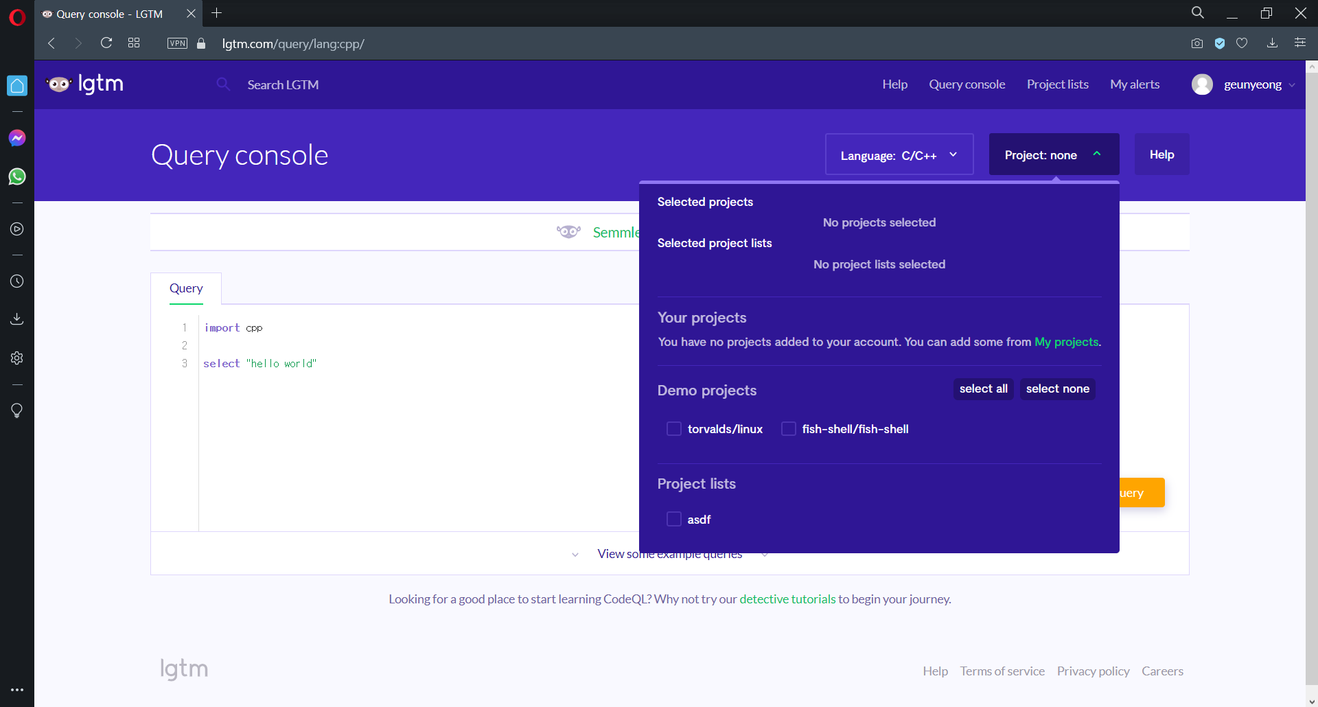 프로젝트를 선택하려하면 기본적으로 torvalds/linux와 fish-shell/fish-shell이 제공될 것이다. 이는 단순히 쿼리 테스트 용으로 쓰라고 보여주는 건데, 소스코드 양이 워낙에 많다보니 스캔에 시간이 많이 걸린다. 내가 원하는 프로젝트를 스캔하고 싶다면 "Your projects"에서 "My projects"를 클릭해 스캔하고자 하는 프로젝트를 추가한다.
