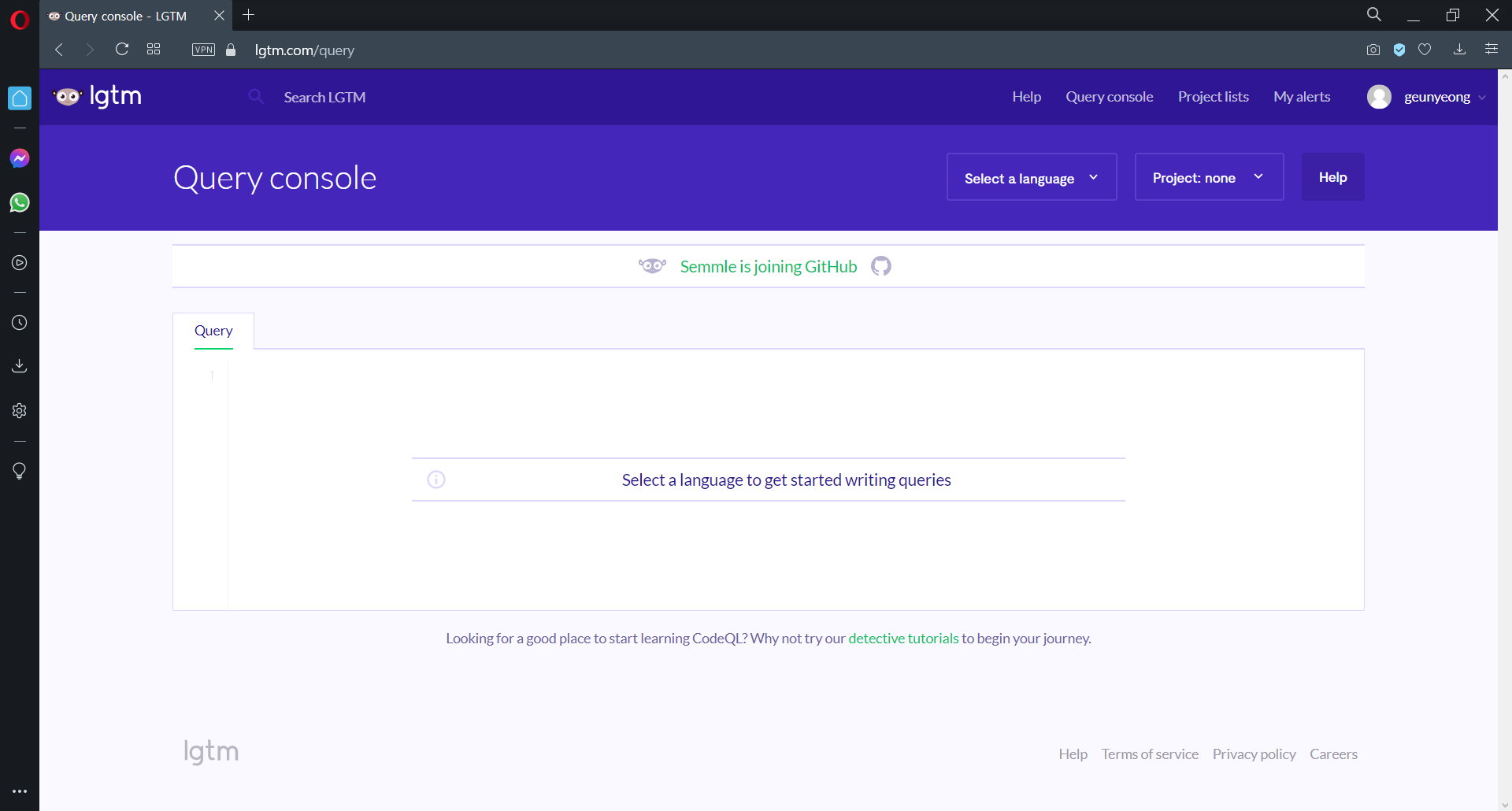 CodeQL을 개발한 LGTM 사이트에서 CodeQL 쿼리를 직접 실행할 수 있는 웹 쿼리 콘솔을 제공한다. 깃허브에 업로드한 자신의 프로젝트나 공개된 다른 사람의 깃허브 프로젝트를 대상으로 CodeQL을 실행할 수 있다. 프로젝트 하나 뿐만 아니라 여러 개의 프로젝트를 대상으로도 가능하다. 본 글에서는 깃허브에 공개되어 있는 프로젝트 하나를 대상으로 Query console에서의 CodeQL 사용법을 살펴보겠다.