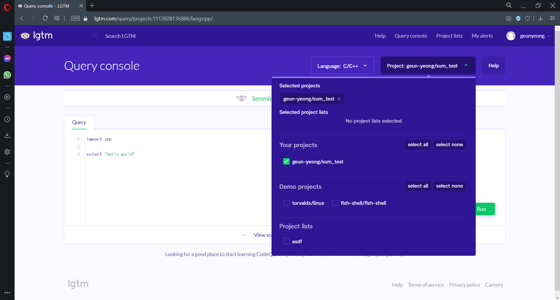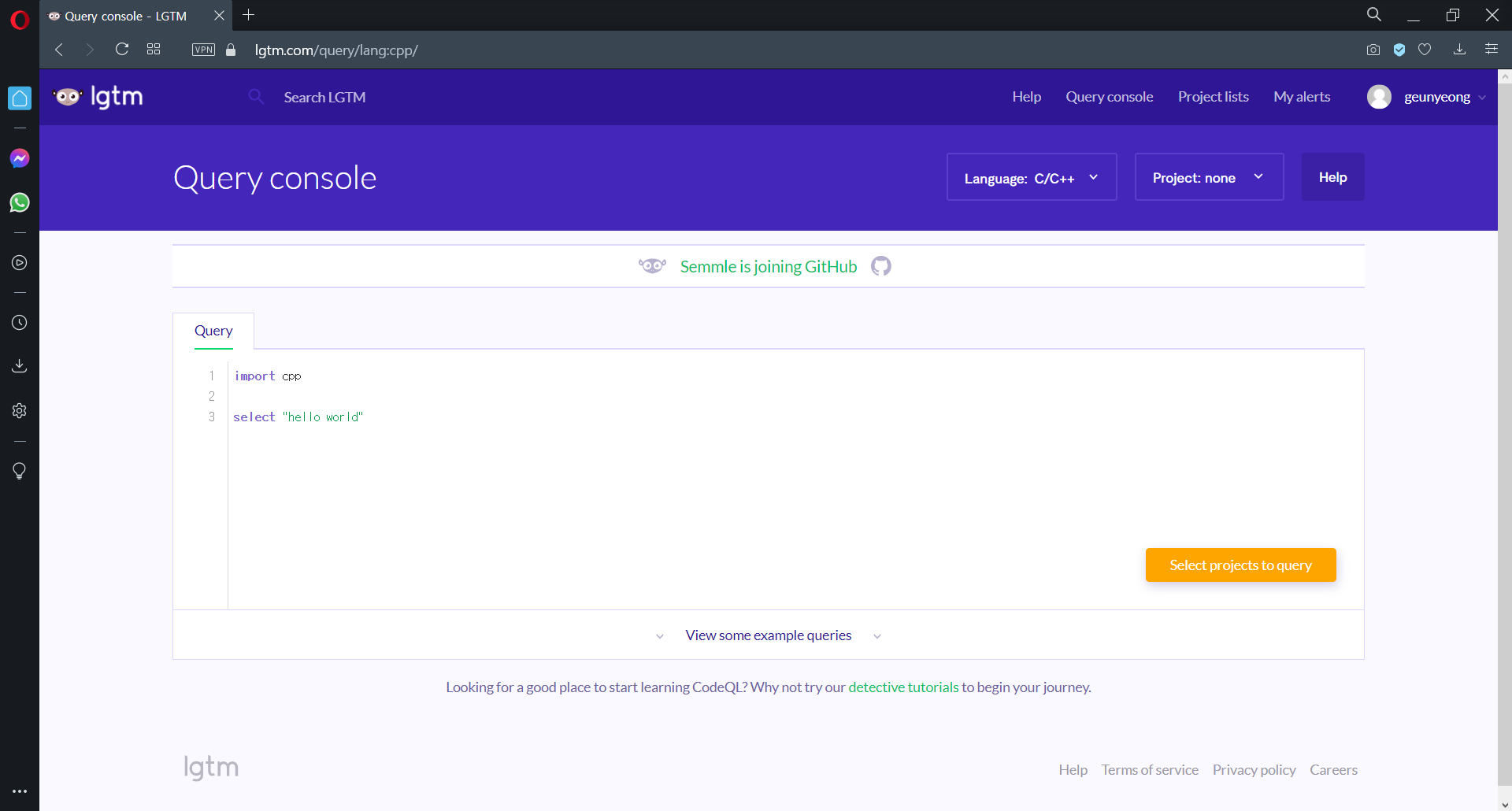 먼저 쿼리할 언어를 선택한다. 스캔할 대상 프로젝트가 C로 이루어져 있기 때문에 언어는 C/C++을 선택했다. 언어를 선택하면 쿼리 작성 영역이 활성화되며 기본 쿼리문(hello world)이 제공된다.