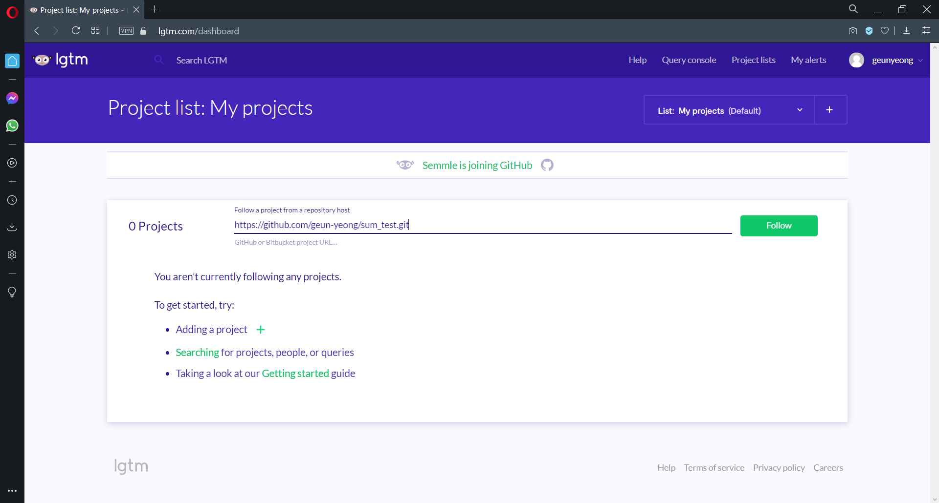 "My projects"를 클릭하면 프로젝트 링크를 입력하는 입력창이 나온다. 이 입력창에 깃 주소를 입력하고 Follow를 클릭한다.