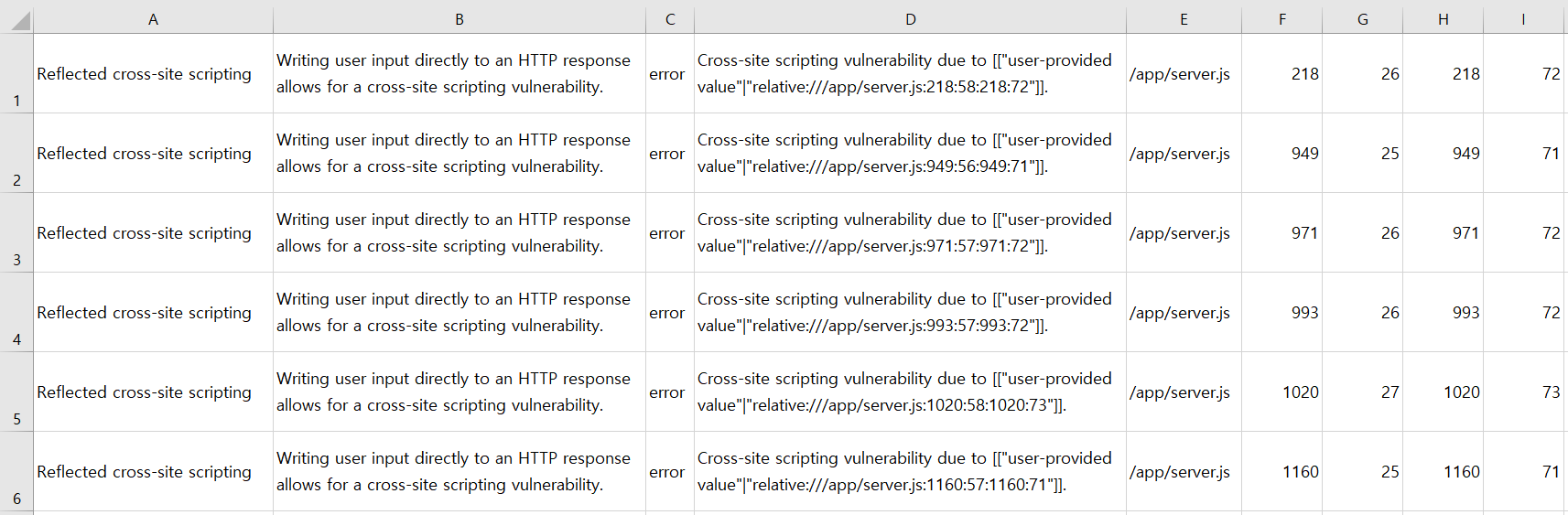 CSV 파일을 열어보면 따로 컬럼명 없이 데이터가 바로 나타난다. 총 6개의 Reflected XSS 요소가 발견됐으며 모두 app/server.js 파일에 존재한다.