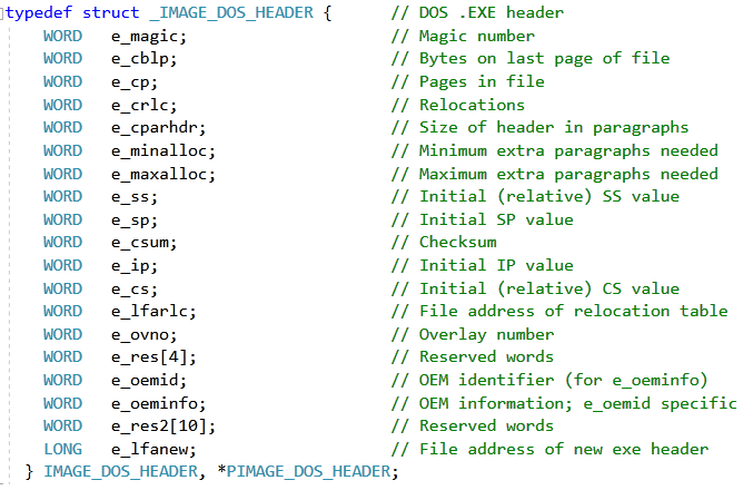 IMAGE_DOS_HEADER는 winnt.h에 정의되어 있다. 가장 주요하게 볼 건 매직넘버 값을 저장하는 e_magic 멤버와 NT 헤더 오프셋을 저장하는 e_lfanew 멤버다. 나머지 멤버들은 실행에 영향을 주지 않는다. 매직넘버 값이 'MZ'가 아니면 정상적으로 실행되지 않는다. e_lfanew 값도 올바른 NT 헤더를 가리키지 않으면 PE 파일은 실행되지 않는다. 바이너리 파일에서 PE 파일을 카빙할 경우 이를 활용할 수도 있다.