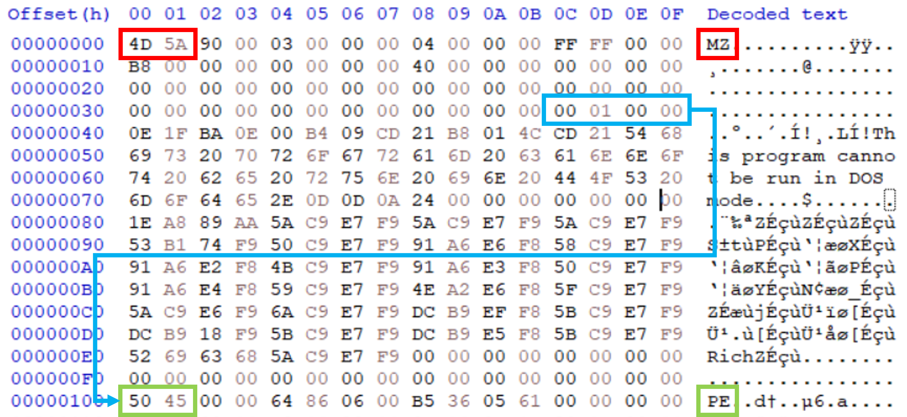파일 내 오프셋 0바이트 위치에 DOS 헤더의 매직 넘버인 'MZ'를 가지는 455Ah 값을 볼 수 있다. 또한 NT 헤더의 오프셋을 가리키는 파일 내 오프셋 3Ch 바이트 위치(e_lfanew)에 Little Endian 형식의 100h 값을 볼 수 있다. 그리고 파일 내 오프셋 100h로 가면 NT 헤더의 시그니처인 'PE\x00\x00'을 볼 수 있다.