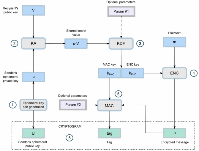 ECIES는 ECC 기반의 비대칭키 암호화와 다양한 대칭키 암호 알고리즘, KDF(Key Derivation Function), MAC을 곁들인다. 이들의 결합 개요도는 아래 그림과 같다.