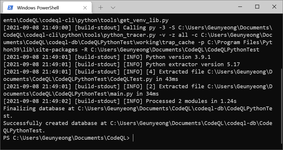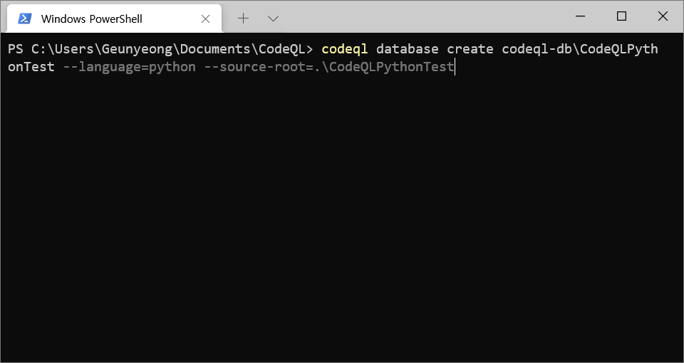 Python 소스 코드 작성이 끝나면 Python CodeQL Database를 생성한다.