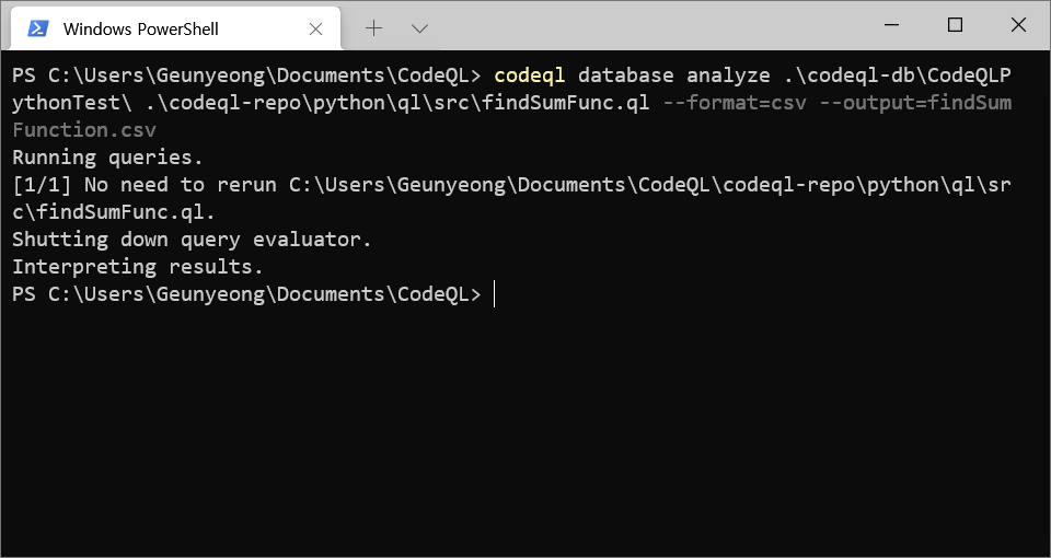 codeql-repo\python\ql\src\findSumFunc.ql를 실행시키고 그 결과를 csv 형식으로 findSumFunction.csv에 저장하라는 의미다. 위 쿼리를 실행하면 별다른 에러메시지 없이 codeql이 종료되고, findSumFunction.csv가 생성된다.