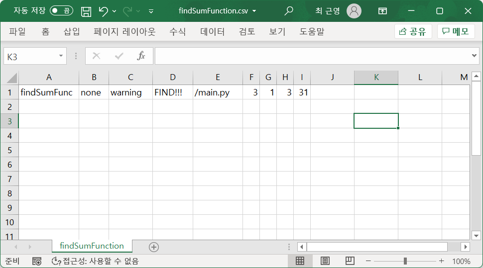 findSumFunction.csv 결과를 보면 main.py의 3번째 줄에 sum 함수가 정의되어 있다는 걸 알 수 있다.