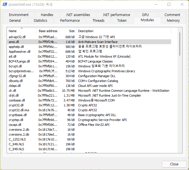 아래 그림은 powershell.exe가 AMSI 기능을 이용하기 위해 amsi.dll을 Import한 모습이다.