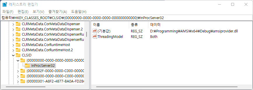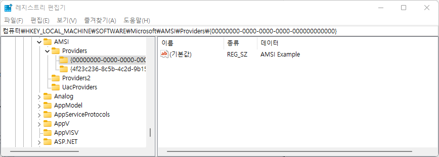 Windows 시스템에 AMSI Provider를 등록하는 방법은 레지스트리에 AMSI 관련 키와 값을 만들어 추가하기만 하면 된다. 32비트 윈도우라면 32비트 AMSI DLL을, 64비트 윈도우라면 64비트 AMSI DLL을 아래 레지스트리에 적절히 추가하면 된다. 이 때 GUID는 AMSI DLL을 작성할 때 사용했던 GUID를 사용하면 된다.