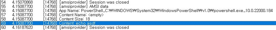 레지스트리에 등록하면 즉시 AMSI Provider로 동작하게 된다. AMSI를 사용하는 PowerShell을 하나 띄우고 아무 명령이나 입력하면 PowerShell에서 입력한 명령을 DebugView로 볼 수 있다.