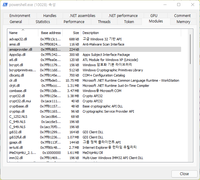 PowerShell 프로세스가 로드한 모듈 목록을 살펴보면 AMSI 레지스트리에 등록한 amsiprovider.dll이 로드된 것을 볼 수 있다.