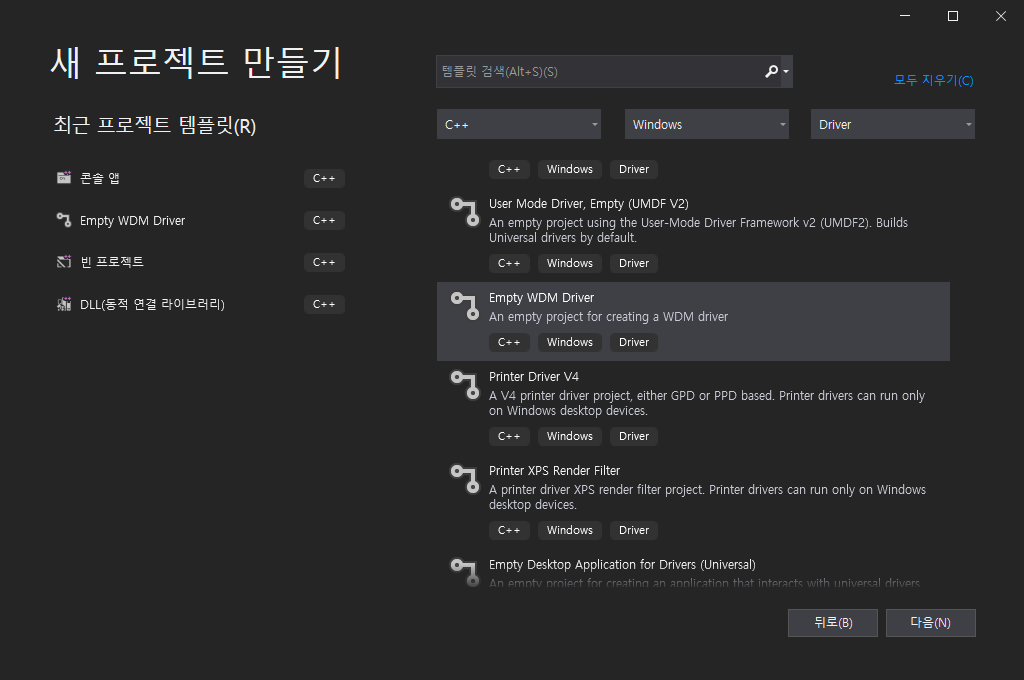 Visual Studio를 설치하고 WDK를 설치하면 Visual Studio 프로젝트 선택 항목에 Driver 타입이 나타난다. 이 중 Empty WDM Driver를 선택하고 프로젝트를 생성하면 된다. 아무런 포맷도 주어지지 않는 커널 드라이버 프로젝트를 만드는 템플릿이다. 만약 드라이버 관련 프로젝트 템플릿이 보이지 않는다면 WDK를 다시 설치해보길 바란다.