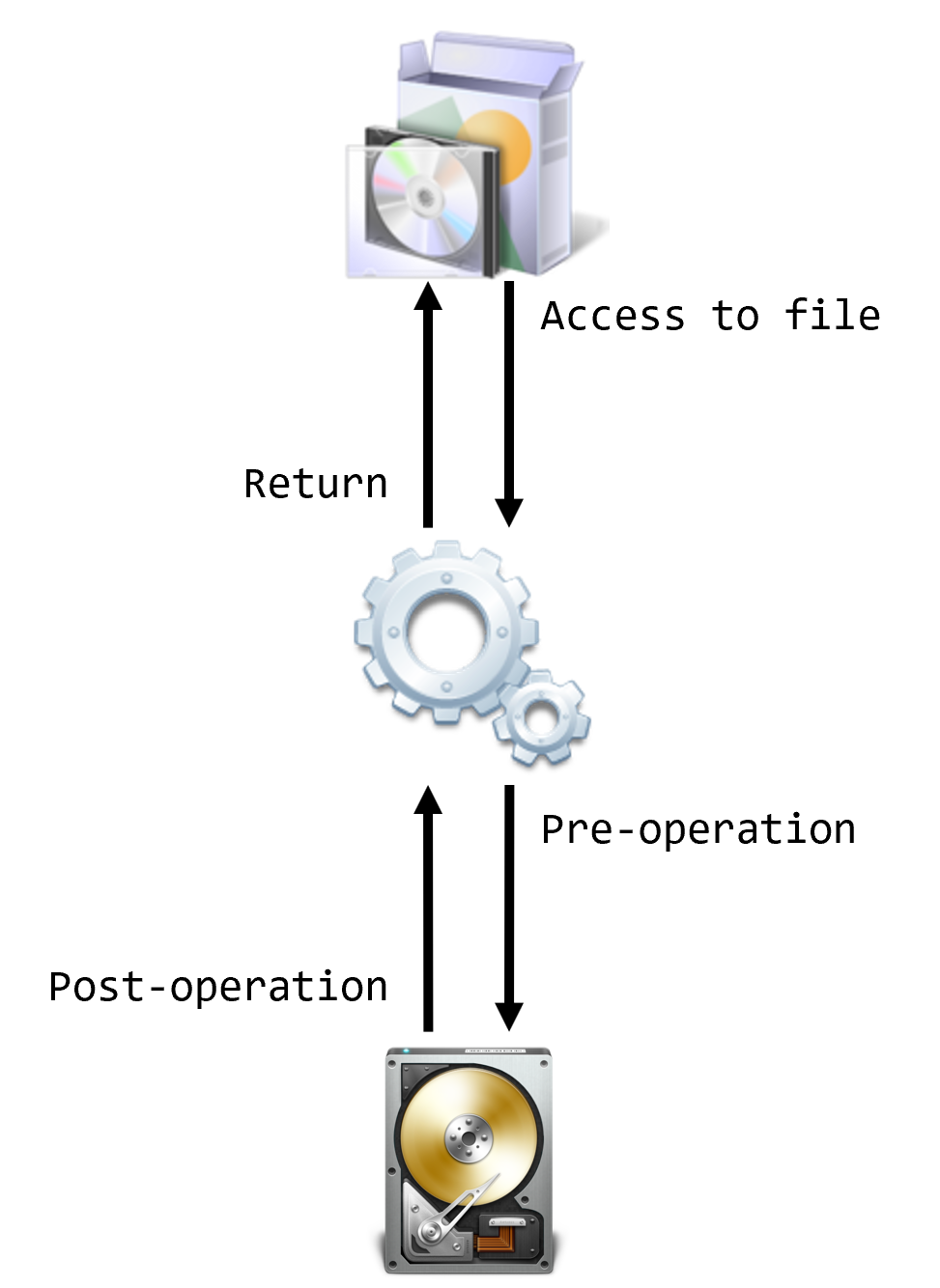 추가로 Pre-Operation에서 FLT_PREOP_COMPLETE를 반환하면 I/O 작업 자체가 미니 필터 선에서 끝나버리므로 주의해야 한다. 이는 하위 NTFS.sys 같은 파일 시스템 드라이버를 포함해, 볼륨 드라이버 및 디스크 드라이버까지 I/O 요청이 전달되지 않는다는 것을 의미한다. 만약 STATUS_ACCESS_DENIED로 작업을 마치고자 한다면 FLT_PREOP_COMPLETE를 반환해야 한다.