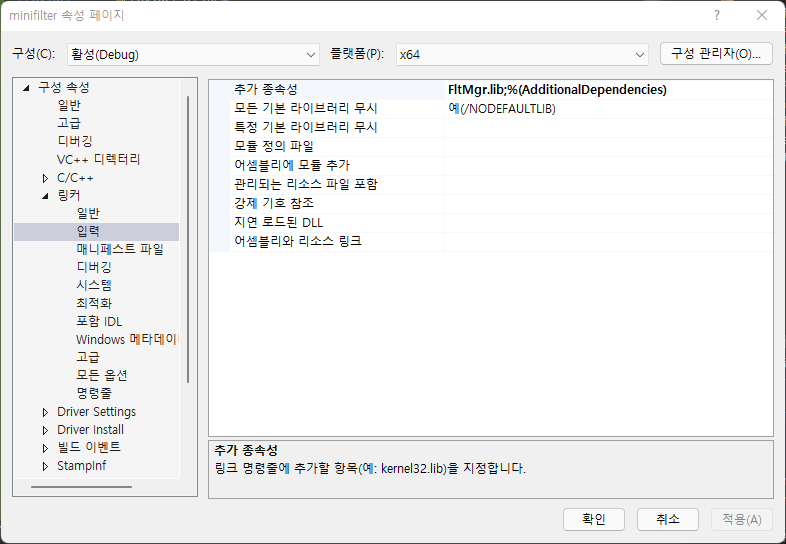미니 필터 드라이버는 FlgMgr.lib를 필요로 한다. 프로젝트 속성의 링커 메뉴에서 FlgMgr.lib를 빌드에 포함시킨다.