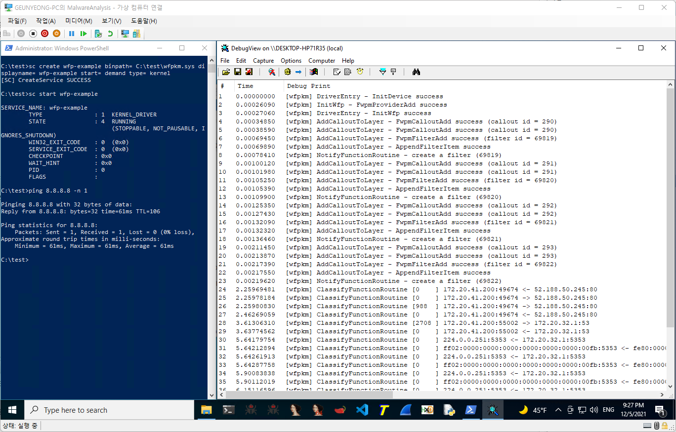 DebugView를 실행시켜 커널 디버그 아웃풋 캡처를 활성화하고 sc start로 서비스를 실행시키면 시스템에서 나가고 들어오는 모든 트래픽의 로컬 IP 및 포트, 원격 IP 및 포트, 해당 트래픽을 발생시킨 프로세스의 PID를 볼 수 있다. 본 예제에서 "->"는 Outbound, "<-"는 Inbound를 의미한다.