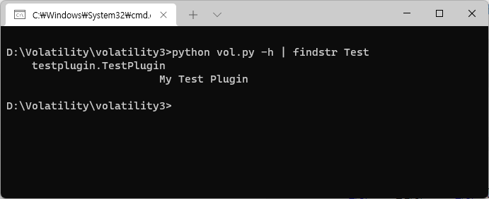 vol.py에 -h 옵션을 주면 사용 가능한 플러그인 목록을 출력한다. -h 옵션으로 testplugin.py의 TestPlugin이 나타나는지 확인하자.