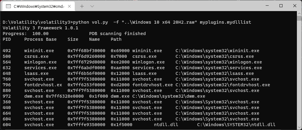 Volatility3의 Documentation에 있는 SImple Plugin 작성법을 따라 DLL 목록을 출력하는 플러그인을 작성해봤다. Volatility3의 플러그인을 만드는 데 필요한 최소한의 기본 소양을 모두 다룰 수 있어 Volatility3에서도 DLL 목록을 출력하는 플러그인으로 예제를 만든 것 같다.