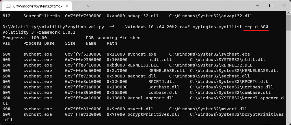 pslist.PsList는 Windows 메모리 덤프에서 EPROCESS를 찾아 프로세스 정보를 구성하다보니 프로세스 이름이 일부 잘리는 경우가 발생한다(프로세스 이름을 저장하는 영역이 16바이트밖에 안되다보니). 그래도 큰 에러 없이 모든 프로세스의 모듈 목록을 잘 출력하는 것을 볼 수 있다.