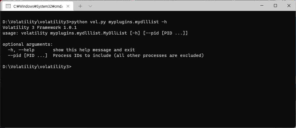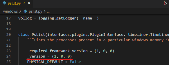주의할 것은 Volatility3의 심플 플러그인 제작 문서에는 pslist의 version을 (1, 0, 0)으로 써놓았는데, 현재 Volatility3 Framework 1.0.1 기준으로 windows.pslist 플러그인의 버전은 2.0.0이다. 그러므로 pslist에 대한 PluginRequirement의 version 값을 (2, 0, 0)으로 해야한다. 즉 내가 사용하려는 다른 플러그인의 버전을 보고 그에 맞추어 넣어줘야 한다.