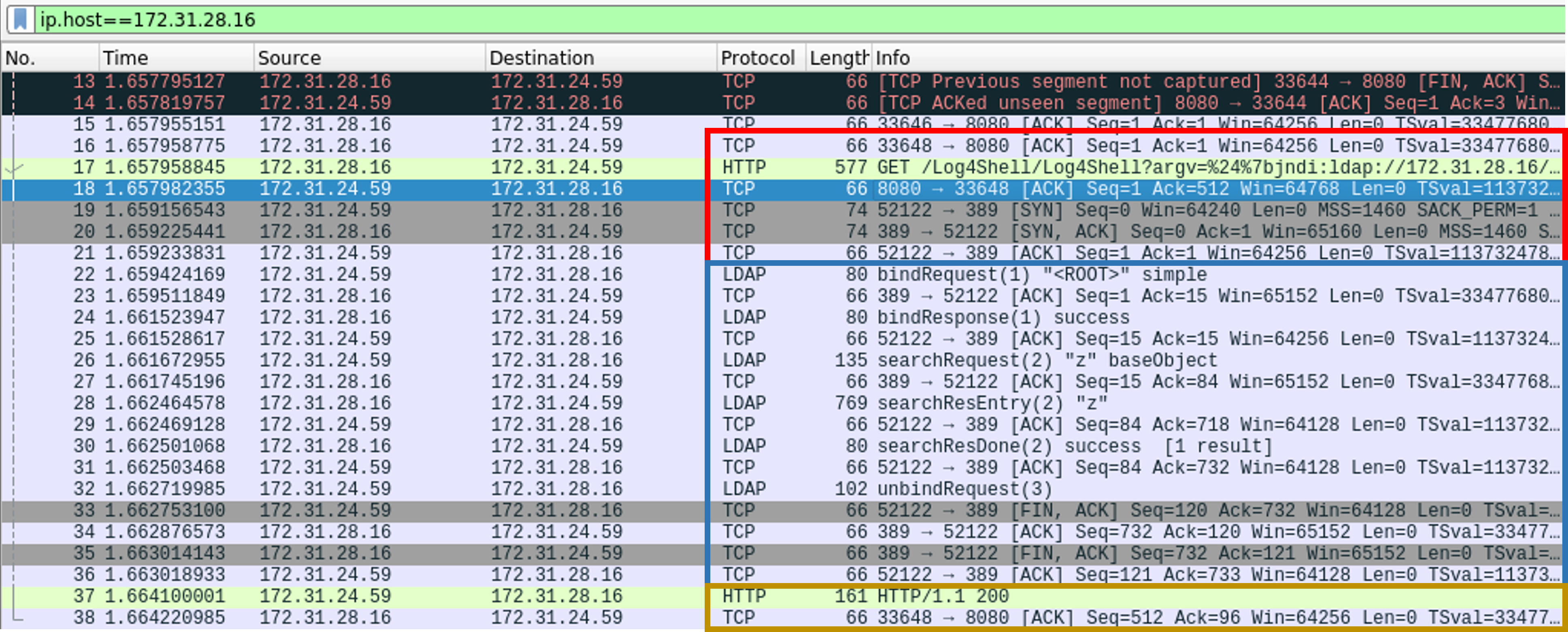 방화벽 장비 등에서 확인 가능한 내용이다. 본 실험에서는 피해 시스템에서 Wireshark를 실행하고 공격자와의 네트워크 통신 내역을 모니터링했다. 그 결과 공격자가 보낸 Log4Shell 익스플로잇 코드가 담긴 요청 패킷이 잡힌 후 곧이어 공격자의 LDAP 서버로 세션을 맺고(붉은색 박스), z라는 이름의 오브젝트에 대한 Search Request를 날리는 걸 볼 수 있었다(푸른색 박스). 그리고 LDAP 요청이 완료되자마자 공격자에게 HTTP 응답 메시지를 보내는 모습도 확인할 수 있었다(황색 박스).