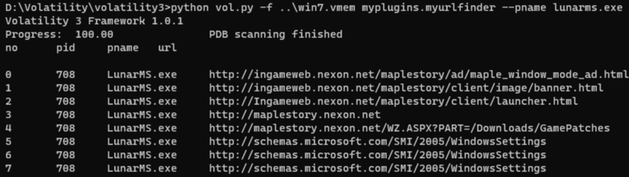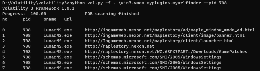 이상으로 각 프로세스의 가상 메모리에 접근해 가상 메모리 덤프 데이터를 가져오고 여기서 우리가 원하는 정보를 추출하는 방법을 알아봤다. 여기까지 했다면 대부분 자신이 원하는 플러그인을 어느정도 만들 줄 알게 되지 않을까 생각한다. 본 URL Finder 플러그인 전체 코드는 아래 Source Code 절에 작성했다.