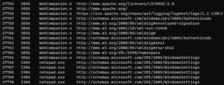 아무런 옵션을 주지 않고 URL Finder 플러그인을 실행하면 모든 프로세스의 가상 메모리에서 URL을 추출하며, 총 27000여개에 달하는 URL이 출력된다.