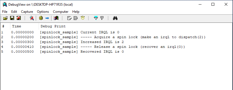 KdPrint(("[spinlock_sample] ----- Acquire a spin lock (make an irql to dispatch(2))\n"));