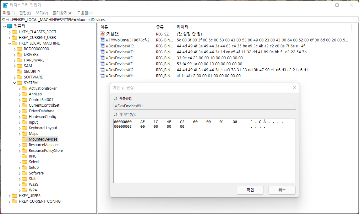 MountedDevices 레지스트리에는 현재 시스템에 Attach된 물리/가상 디스크들을 볼 수 있다. 각 디스크는 \DosDevices를 접두사로 하는 MS-DOS Device Name 형식으로 Windows 시스템에서 접근할 수 있는데, MountedDevices 서브키에 해당 이름이 Value로써 존재한다. 각 Value의 Data는 바이너리 데이터가 저장되는데, 이 중 첫 4바이트가 부트 코드에서 볼 수 있는 디스크 시그니처다. 위 그림의 첫 4바이트인 'AF 1C 4F C2'와 DoS Partition Disk Signature 그림의 디스크 시그니처를 비교하면 동일하다는 걸 알 수 있다.