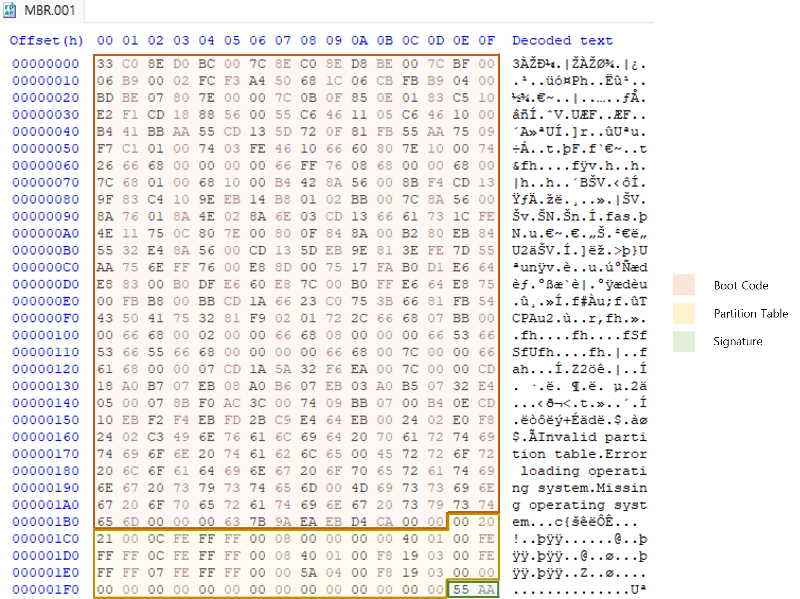 0 바이트 오프셋부터 445 바이트 오프셋 까지 446 바이트가 부트 코드다. 위 그림에서 붉게 표시된 영역이다. 부트 코드는 파티션 테이블에서 부팅 가능한 파티션을 찾아 해당 파티션의 부트 코드로 점프하는 역할을 한다. 텍스트로 디코딩된 영역을 보면 "Invalid partition table", "Error loading operating system", "Missing operating system" 같은 에러 메시지도 볼 수 있다. 내용에서 알 수 있듯 파티션 테이블을 분석하고 부팅 가능한 파티션을 찾는다는 걸 알 수 있다.