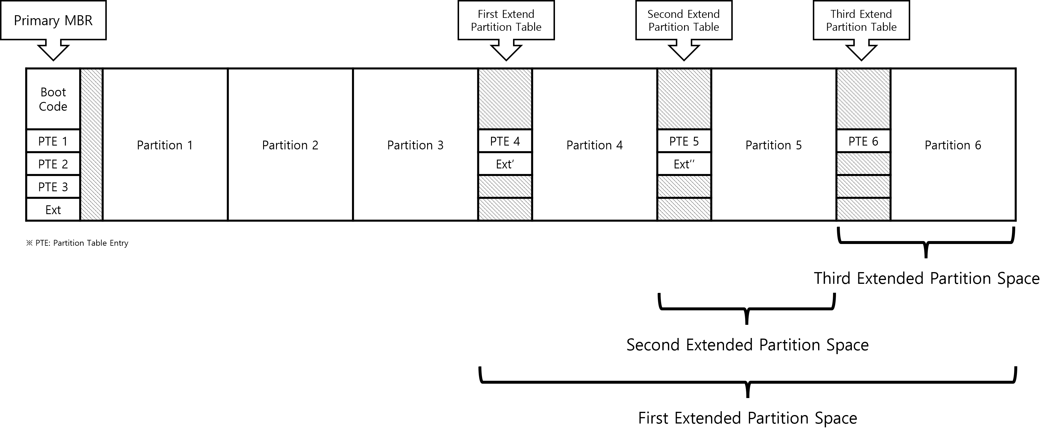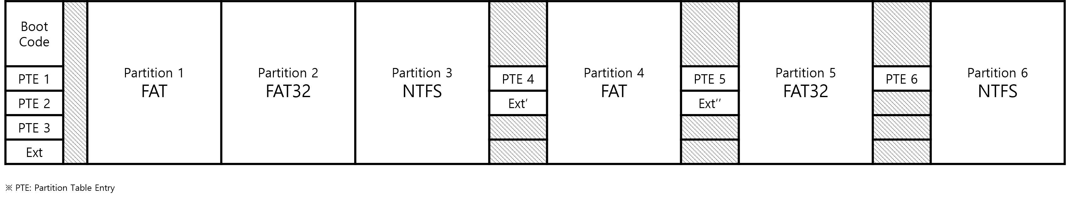 - 파티션 개수가 4개를 초과해 확장 파티션을 사용하는 경우 N번째 파티션의 정보는 N-3번째 파티션 테이블에 존재한다. 4번 파티션은 첫번째 확장 파티션 테이블에, 5번 파티션은 두번째 확장 테이블에 파티션 정보가 기록된다. 단, N은 3보다 크다.