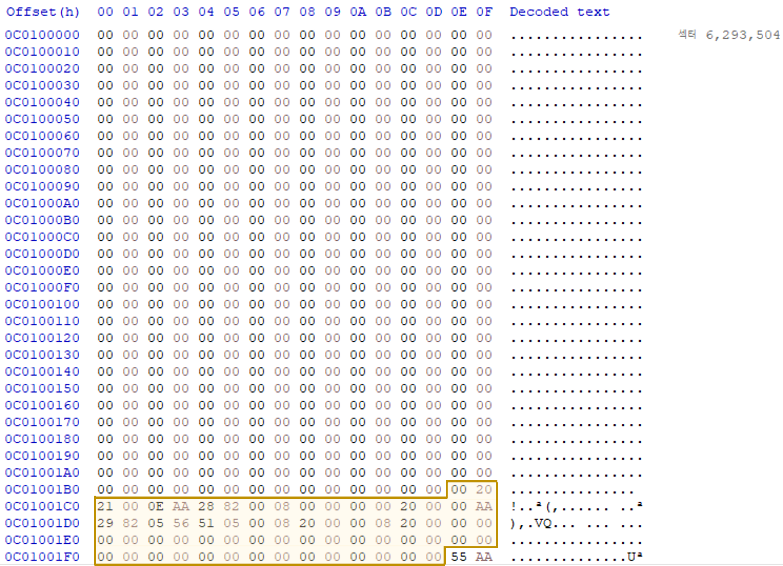 주 파티션 테이블에서 확장 파티션을 나타내던 엔트리가 카리키는 섹터는 6,293,504(0x600800)였다. 섹터 크기인 512를 곱하면 0xC0100000이 된다. 해당 영역으로 가보면 부트 코드 영역은 모두 널 바이트로 채워져있고 파티션 테이블만 활성화되어 있는 걸 볼 수 있다.