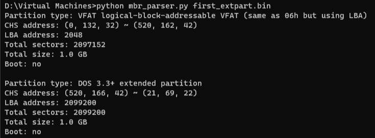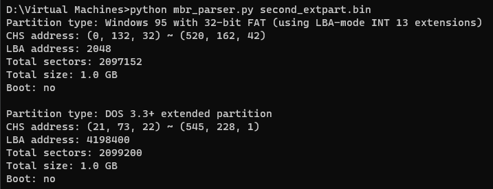 확장 파티션의 파티션 테이블에서 확장 파티션을 제외한 일반 파티션의 시작 LBA 주소는 각 확장 파티션의 시작 주소를 시작 오프셋으로 한다. 즉, 4번째 파티션(위 표에서 첫번째 엔트리)의 시작 섹터 주소는 첫번째 확장 파티션의 시작 섹터인 0x600800에서 0x800을 더한 0x601000(6,295,552)이 된다. 섹터 6,295,552로 가면 FAT의 VBR을 볼 수 있다. 즉 4번째 파티션부터는 확장 파티션이 해당 정보를 갖고 있으며, 첫번째 확장 파티션은 4번 파티션의 정보를 가진다.