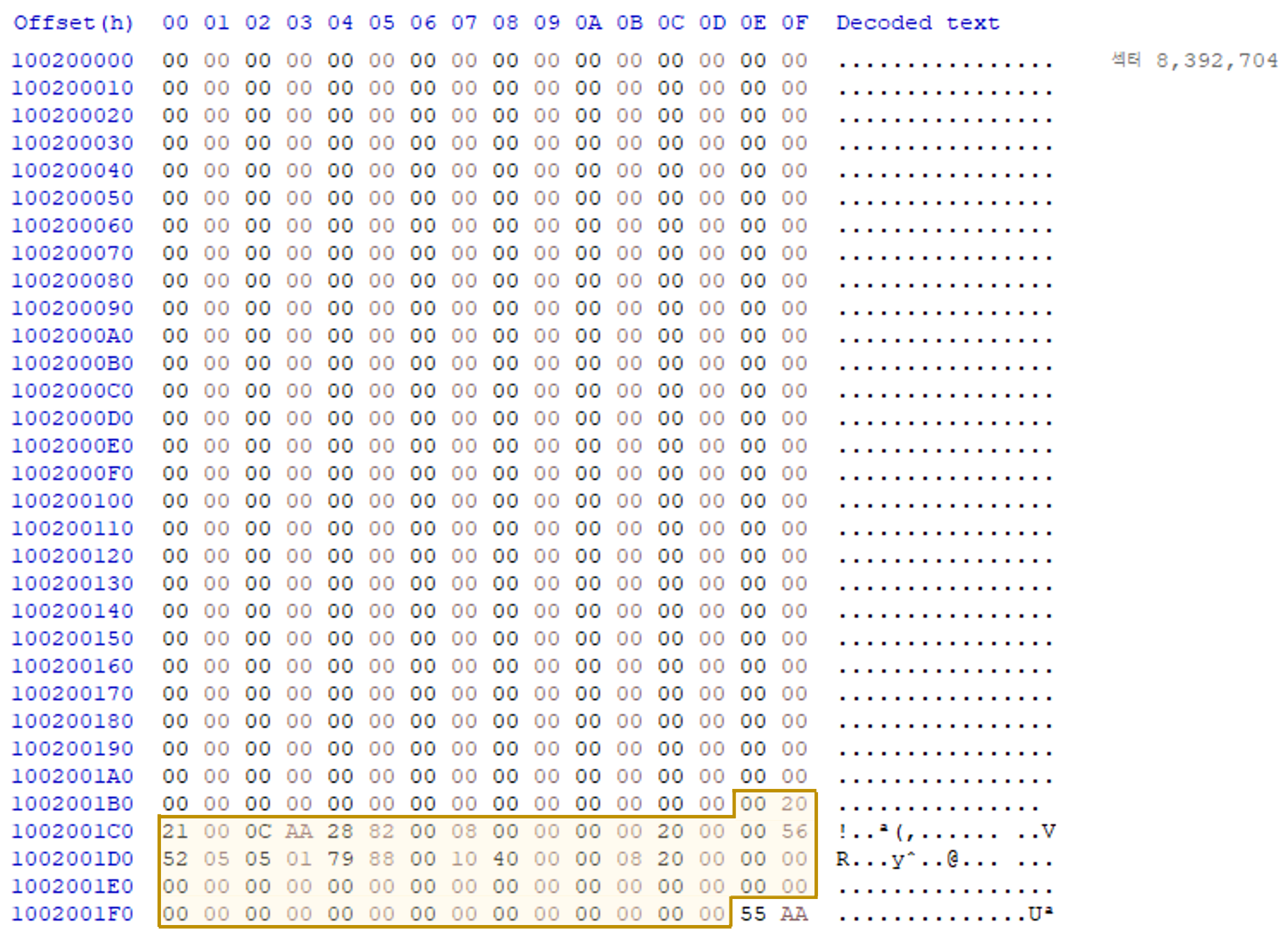 2번째 확장 파티션의 위치는 섹터 8,392,704(0x801000)이다. 512를 곱해 바이트 오프셋을 구하면 0x100200000이다.