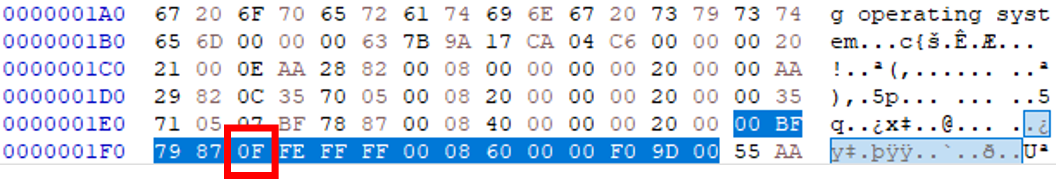 위 그림에서 드래그된 영역이 확장 파티션 테이블이 위치한 섹터를 나타내는 파티션 테이블 엔트리다. 이를 분석하면 아래 표와 같다.