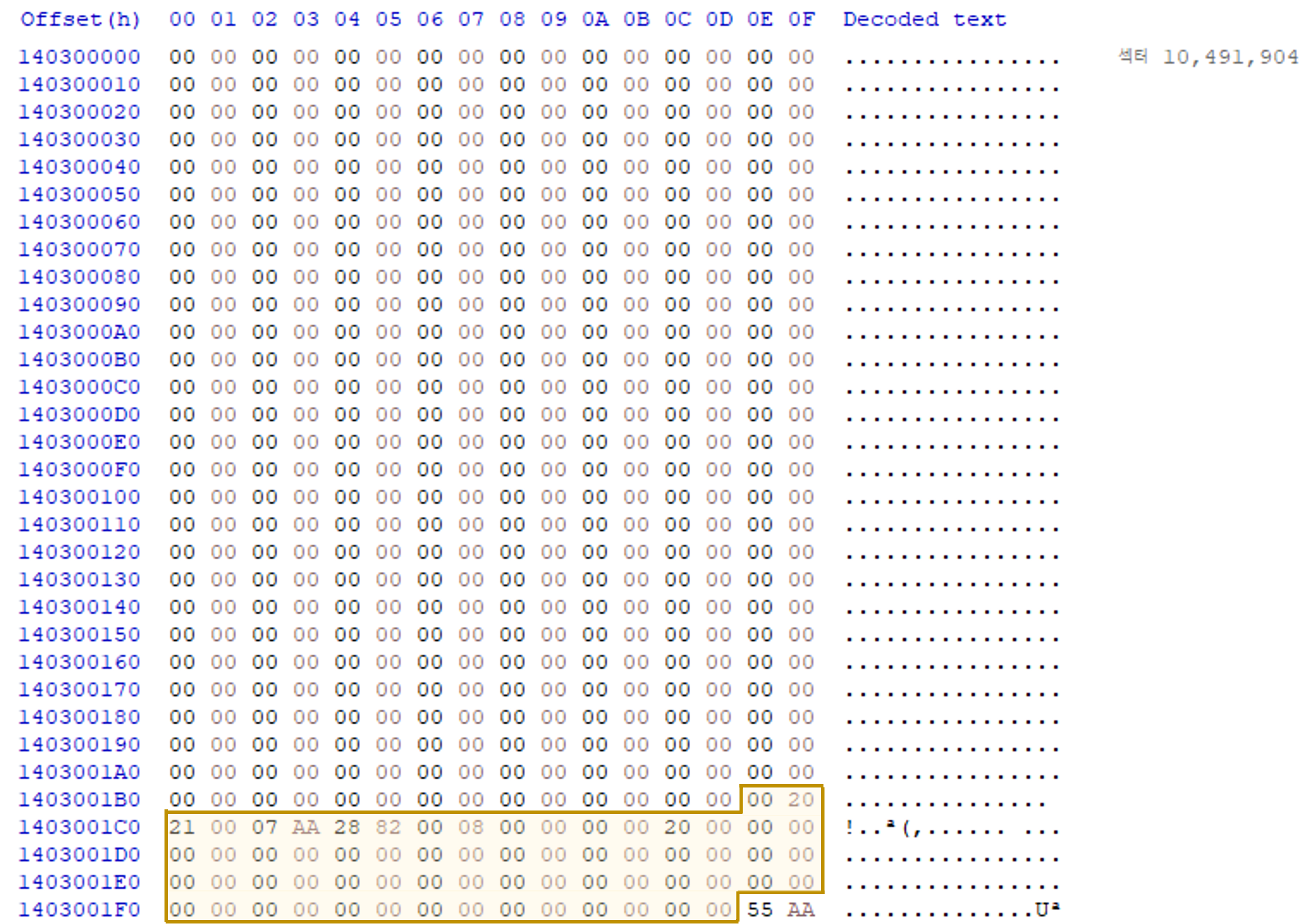 세번째 확장 파티션의 시작 섹터인 10,491,904(0xA01800)로 가보면 또다시 도스 파티션 형식이 나타난다.