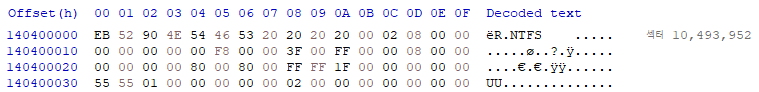 세번째 확장 파티션의 시작 섹터인 10,491,904(0xA01800)에 6번 파티션의 시작 LBA 값인 2,048을 더하면 10,493,952(0xA02000)이 된다. 6번 파티션의 정보는 세번째 확장 파티션이 갖고 있다. 해당 위치로 가보면 NTFS의 VBR이 있음을 볼 수 있다.