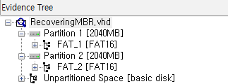 4GB 크기의 VHD를 만들고, 2040MB 크기의 파티션과 FAT 볼륨 2개를 생성했다. 그리고 두번째 FAT 볼륨이 위치한 파티션을 가리키는 파티션 테이블 엔트리를 모두 삭제했다. 이제 두번째 파티션을 복구해보자. 예제 이미지 파일은 아래 링크에 있다.